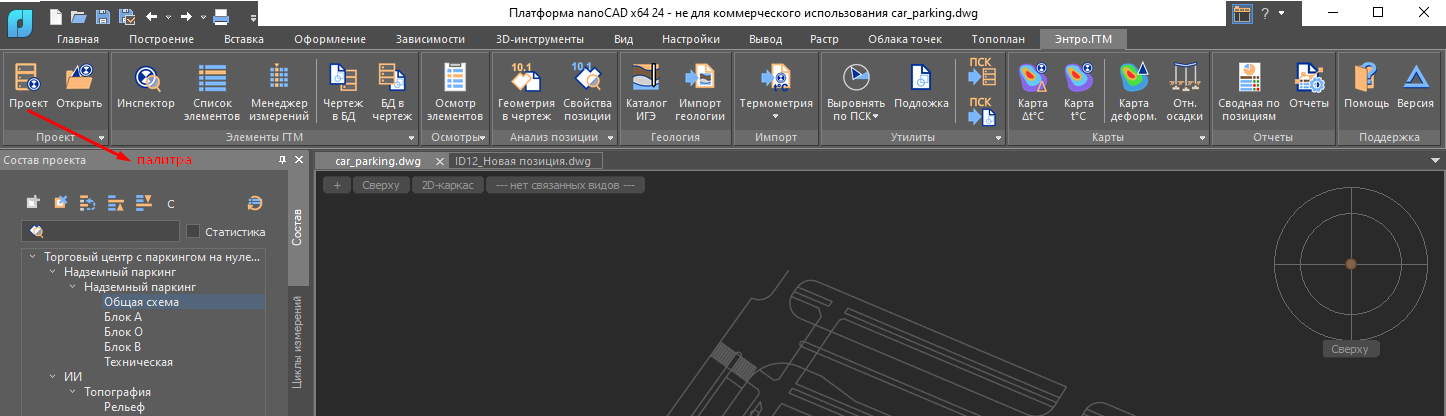- Открывается специальная палитра Энтро.ГТМ - аналогично стандартной палитре nanoCAD "Свойства". Она может быть удобно размещена прилипанием к краям окна nanoCAD или к другим палитрам;