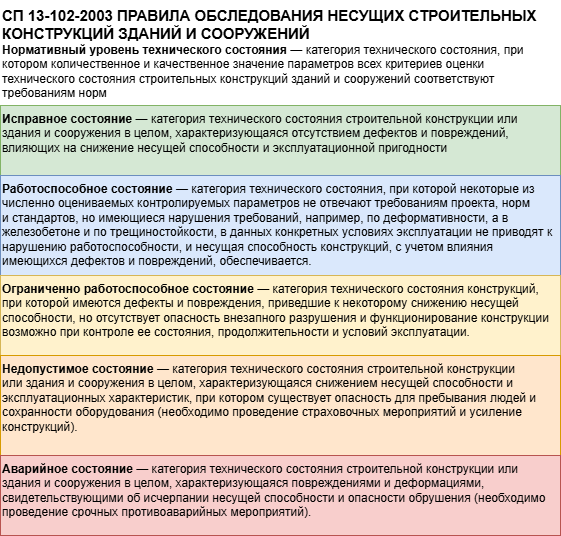 | IV - аварийное | Наличие повреждений и деформаций, свидетельствующих об исчерпании несущей способности и опасности обрушения и (или) наличие кренов, которые могут вызвать потерю устойчивости объекта |