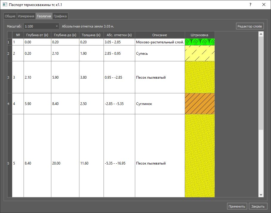 Есть в паспорте термометрических скважин и позволяет через Редактор слоёв добавить элементы геологической колонки из классификатора инженерно-геологических элементов проекта (см группу Геология).
