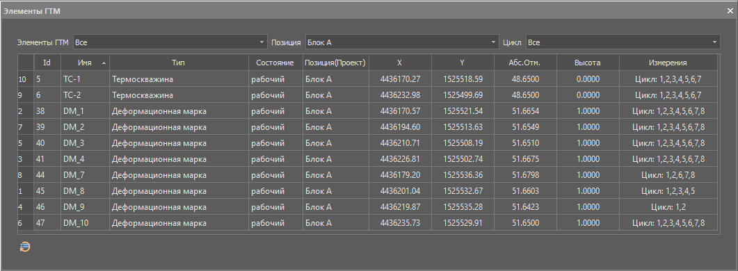 В верхней части окна Списка элементов имеются фильтры элементов по типам, позиции в проекте и по наличию измерений по циклам ГТМ. Последнее даёт возможность проконтролировать все ли измерения импортированы в БД в текущем или выбранном цикле.