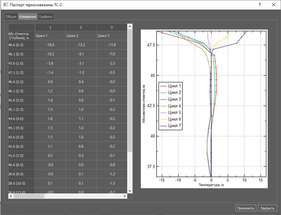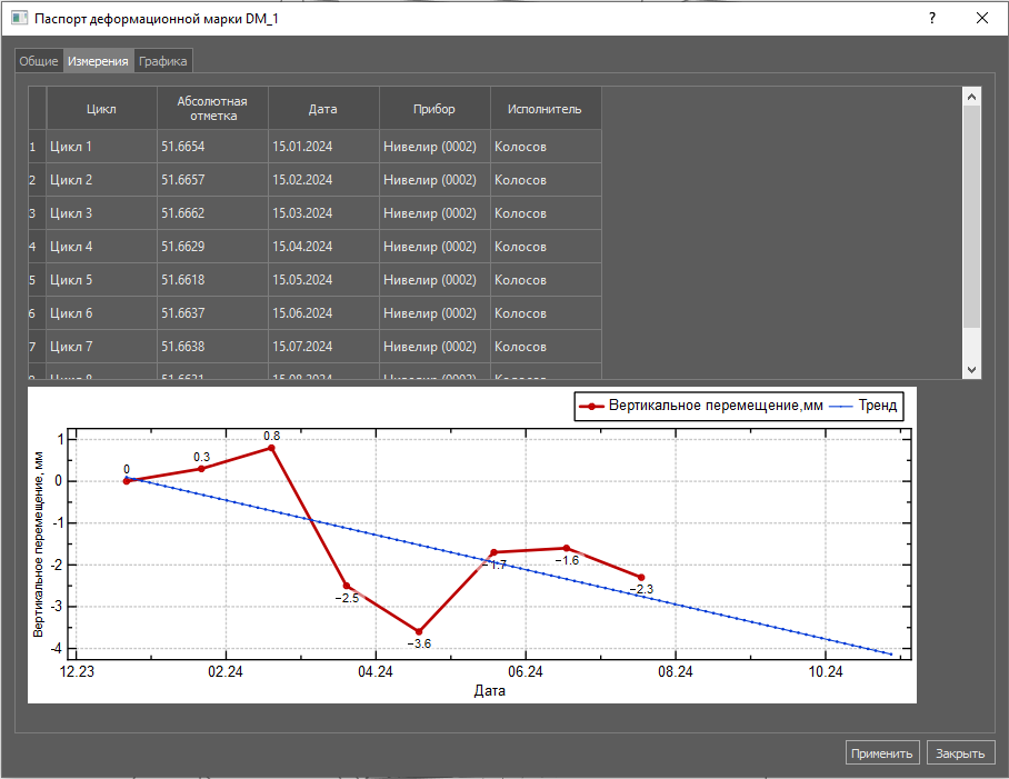 После того как для загружены данные измерений первого цикла в средствах работы с элементами появляются соответствующие данные и значения, а в «Электронном паспорте» измерения отображаются в виде диаграммы и таблицы.