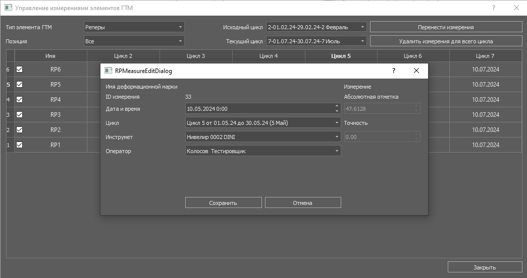 Описан в главе Интерфейс. Позволяет удалять и перемещать измерения в циклах и редактировать даты и другую атрибутику.