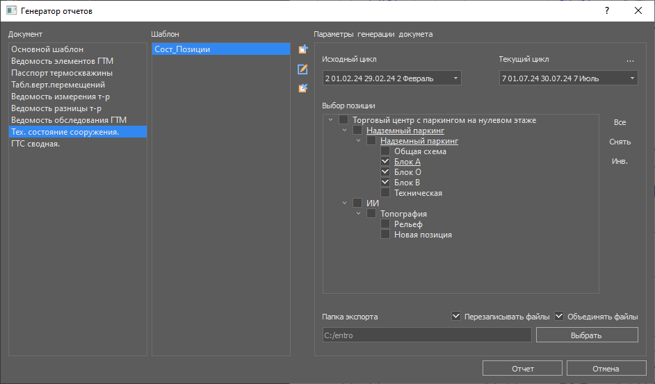 Существуют отчеты по выбранным элементам или позициям которые можно объединять в один файл. Например Паспорта термоскважин и Техническое состояние здания и сооружения.