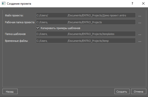 Имя файла проекта присвоится автоматически. При необходимости можно изменить имя файла и его расположение, а также расположение папок шаблонов и временных файлов.
