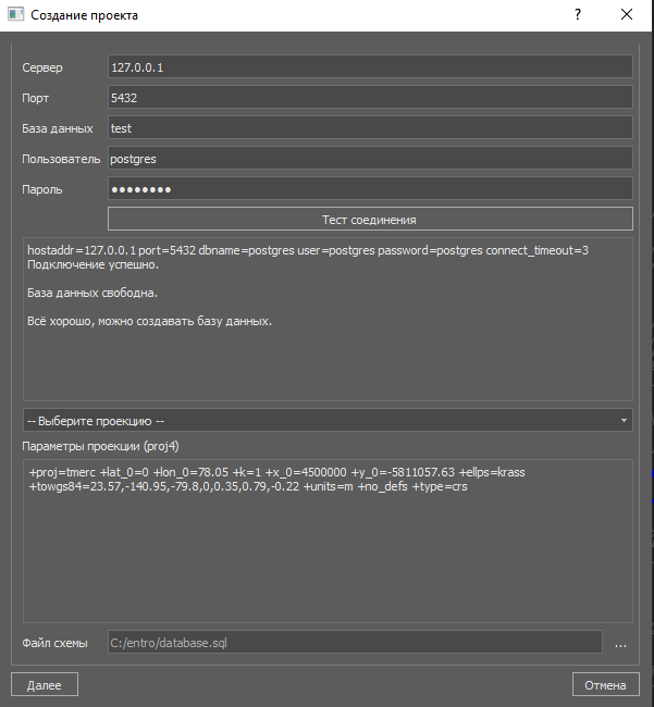 Сначала устанавливается соединение с СУБД. Укажите параметры подключения к PostgreSQL и учетные данные, после чего нажмите "Тест соединение". Если настройки верны в консоль будет выдано сообщение об успехе.