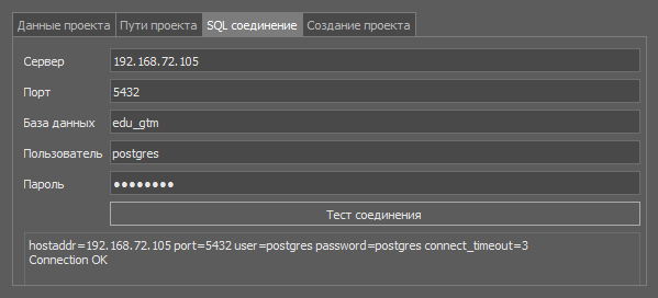 Укажите параметры подключения к PostgreSQL и учетные данные, после чего нажмите "Тест соединение". Если настройки верны в консоль будет выдано "ОК"