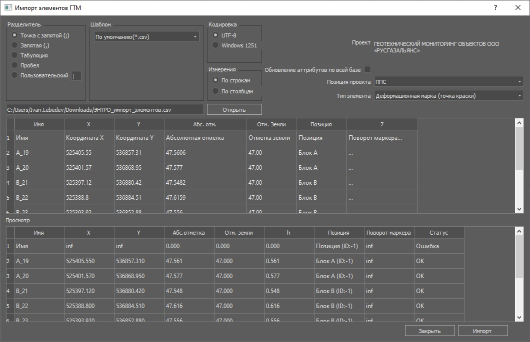 | Имя | Координата X | Координата Y | Абсолютная отметка | Отметка земли | Позиция | Поворот маркера |